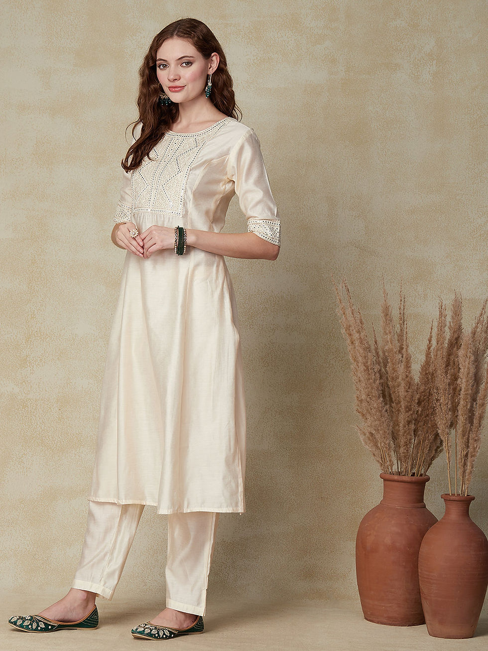 Solid Mirror, Resham & Zari Embroidered Paneled A-Line Kurta With Pants